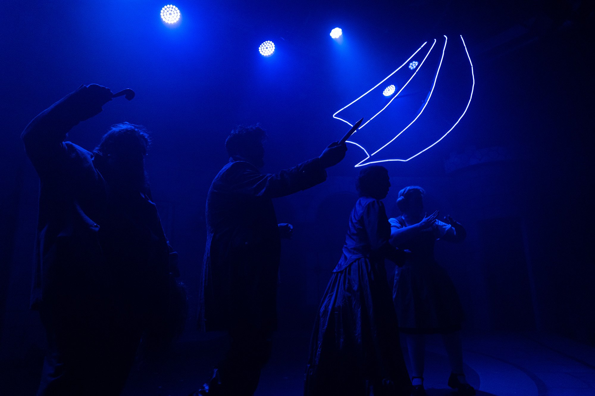 In the beginning of the play each actor has a book they are reading from to introduce the story. Each book was hollowed out to facilitate a large square LED light that illuminated each of their faces during this scene.